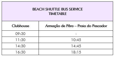 We are very pleased to inform you that we have a courtesy shuttle service to the beach, at Armação de Pêra, during the day.