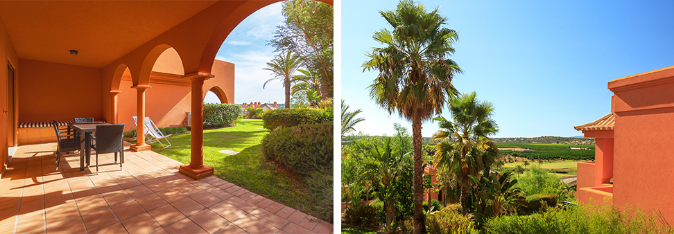 No piso térreo, com aproximadamente 108m2, os nossos apartamentos de 2 quartos têm uma espaçosa sala de estar em planta aberta, cozinha totalmente equipada, 2 quartos, 2 casas de banho, acesso a um terraço e a alguns dos melhores campos de golfe em Portugal.