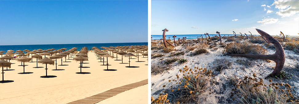 Du sable blanc et doux, voilà ce que vos pieds trouveront une fois arrivés à la plage de Barril (Praia do Barril) à Tavira. Mais avant, vous devez traverser le pont et faire un voyage de 8 minutes en train, ou une marche de 15-20 minutes. Les enfants (et les adultes !) adorent généralement le trajet en train, car il traverse le Parc Naturel de Ria Formosa, ce qui permet à chacun d'admirer la faune et la flore en chemin. "Perpétua-das-areias", une petite fleur que l'on trouve ici, rend également ce trajet spécial, car elle laisse un parfum rafraîchissant dans l'air.