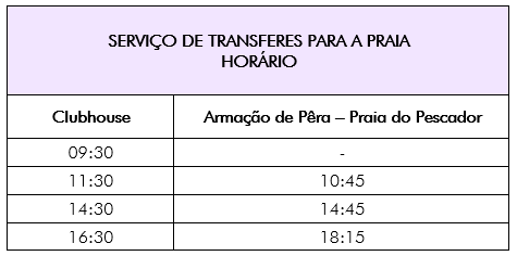 Poderá consultar os horários deste serviço diário, no quadro abaixo, cuja reserva deverá ser efetuada no ClubHouse, até 24 horas antes.